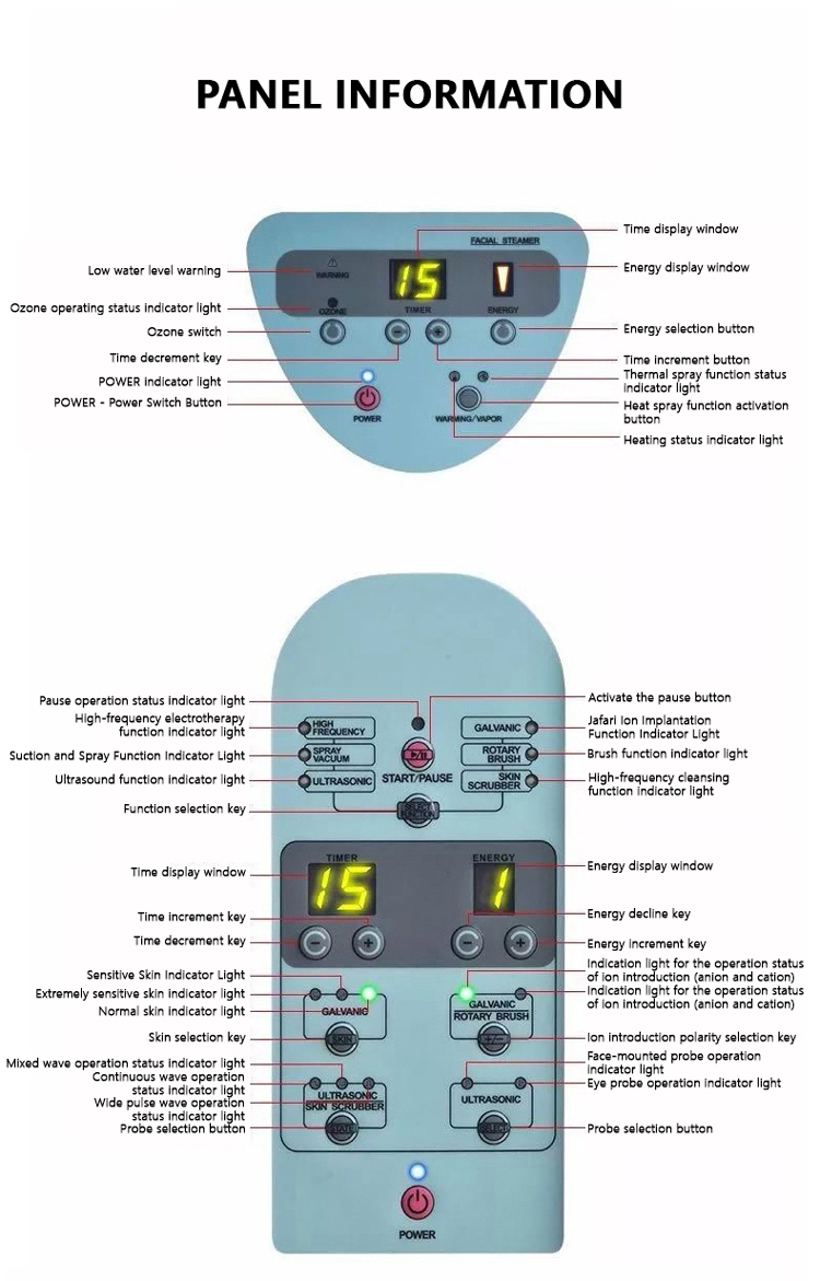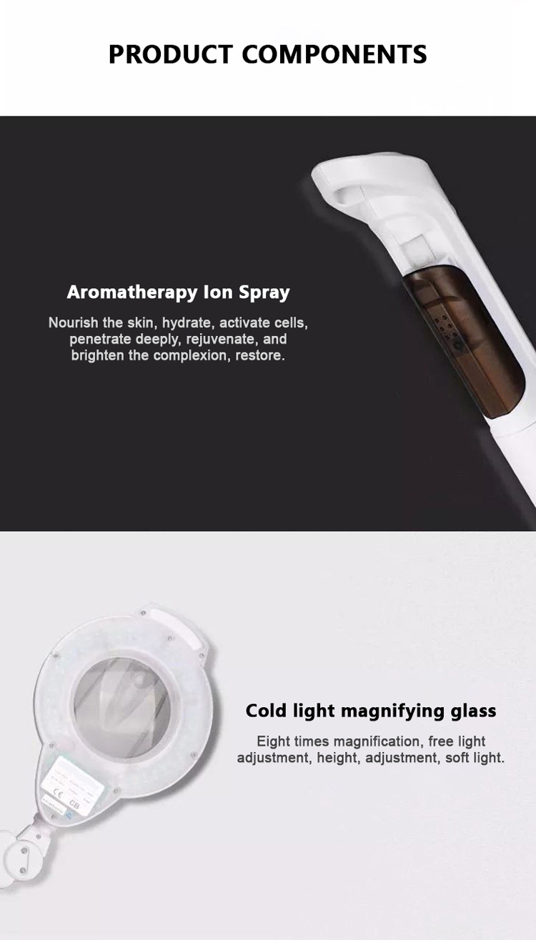 Instrumento de belleza multifuncional / ultrasonido / limpiador facial / alta frecuencia / cepillo rotatorio / galvánico / aspirador por pulverización / vaporizador facial / lámpara de aumento